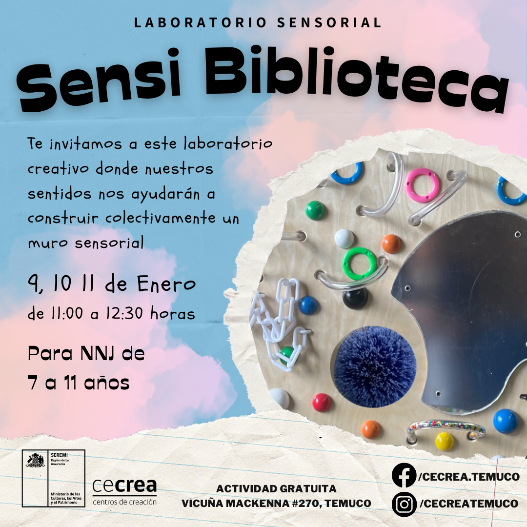 Título: Sensibiblioteca Laboratorio de creación de paneles y muros sensoriales (Material comunicacional). Descripción: Material comunicacional creado para la difusión del Laboratorio Sensibiblioteca Laboratorio de creación de paneles y muros sensoriales.