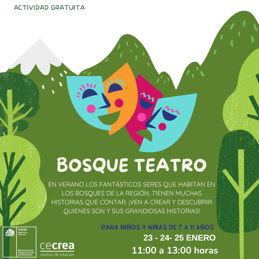 Título: Bosque Teatro (Planificación). Descripción: El taller «Bosque Teatro» tiene como objetivo principal explorar la riqueza de la flora y fauna nativa chilena a través de la lente del teatro. Los participantes se sumergirán en la naturaleza del país, conectándose con su entorno de una manera única y creativa. Utilizando el teatro como herramienta, los niños y niñas desarrollarán creaciones artísticas que reflejen su comprensión....