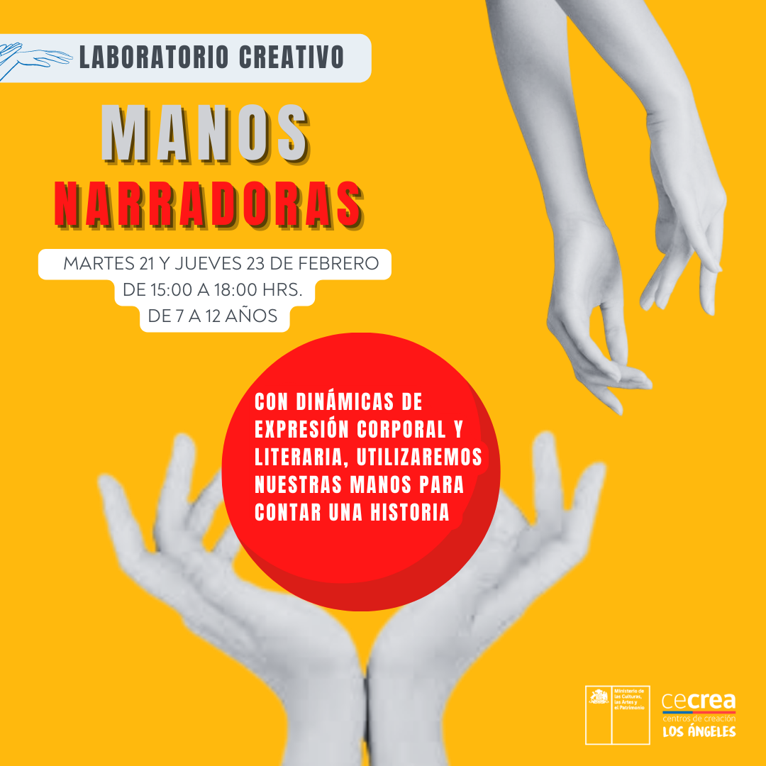 Título: Laboratorio Manos narradoras (Material comunicacional). Descripción: Material comunicacional creado para la difusión del Laboratorio Manos narradoras.