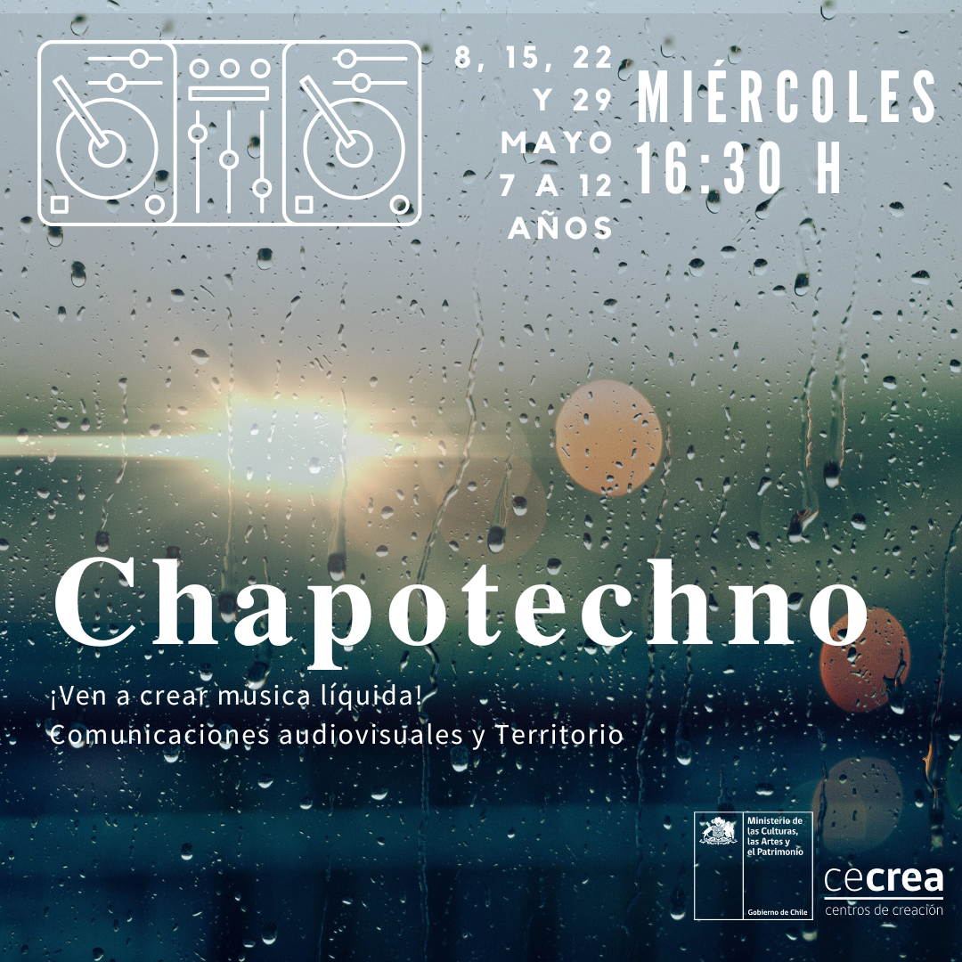 Título: Chapo Tecno (Planificación). Descripción: Laboratorio creativo que nos invita a relacionarnos creativamente con el agua como un paisaje sonoro del territorio. Este Paisaje sonoro, que nos convoca a la creación musical a partir de nuestras escuchas y grabaciones líquidas de nuestro entorno diario.