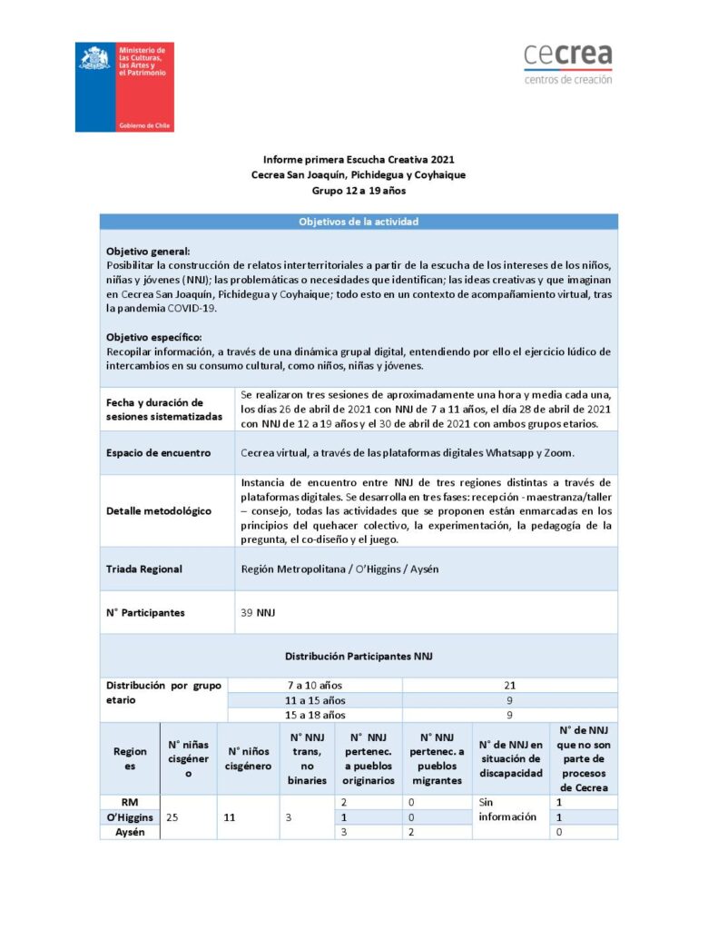 Cecrea San Joaquín, Pichidegua y Coyhaique, Informe primera Escucha Creativa 2021, Grupo 12 a 19 años.. obragruesaadm / 29 julio, 2021