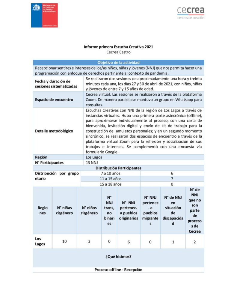 Cecrea Castro, Informe primera Escucha Creativa 2021