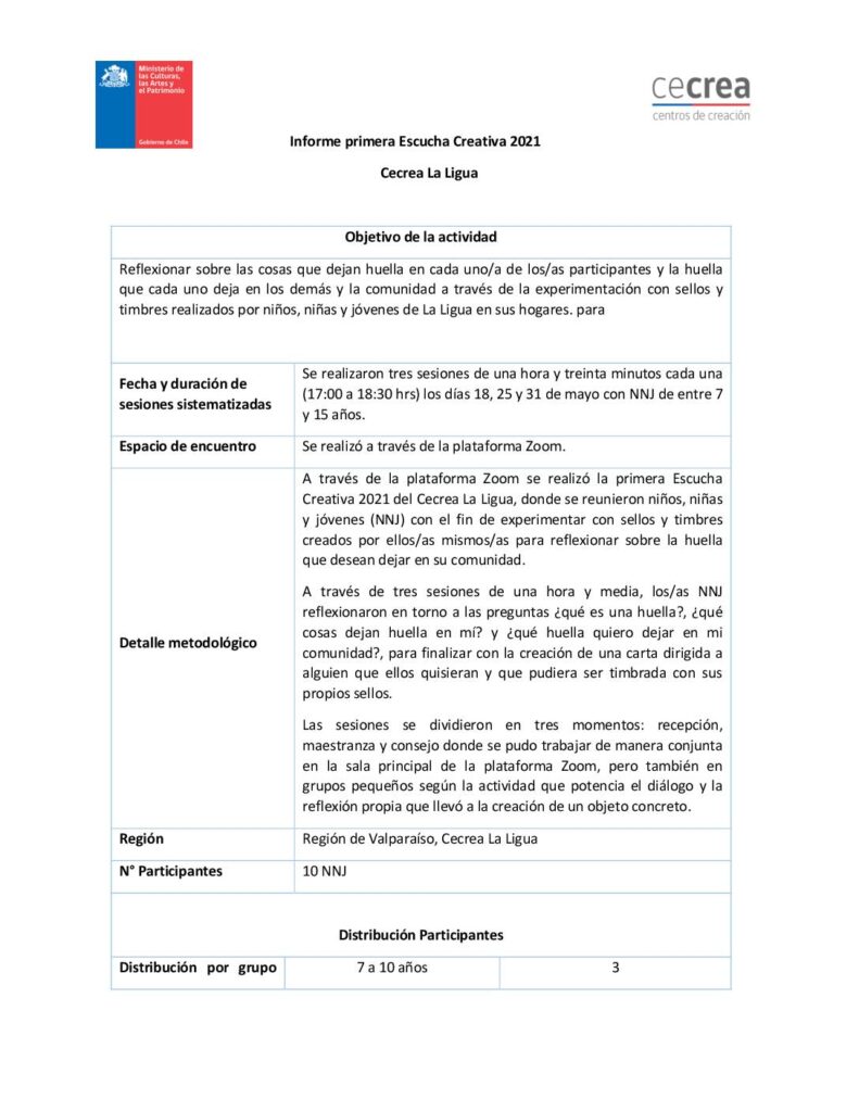 Cecrea La Ligua, Informe primera Escucha Creativa 2021