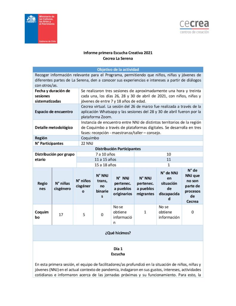 Cecrea La Serena, Informe primera Escucha Creativa 2021