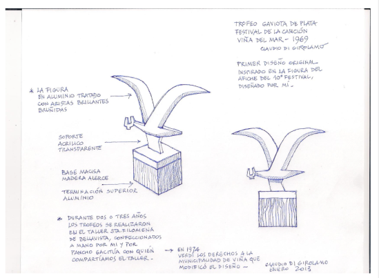 Esbozo de la Gaviota, Trofeo del Festival Internacional de la Canción de Viña del Mar. Creación de Claudio di Girolamo, 1969, inspirado en la figura del afiche del 10° festival, también creado por el mismo autor. Durante los primeros años, estos trofeos se realizaron en el taller de Santa Filomena, barrio Bellavista en Santiago. Eran hechos a mano por di Girolamo y por el escultor Francisco Gacitúa. En 1974, los derechos fueron vendidos a la Municipalidad de Viña del Mar.